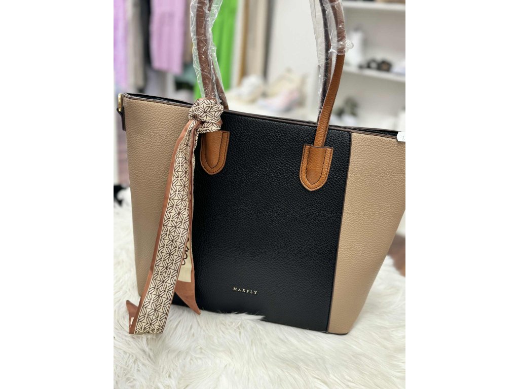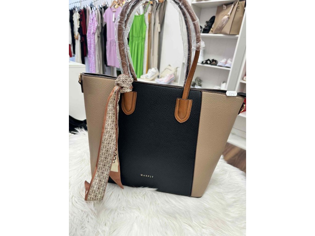 Stylová dvoubarevná kabelka v kombinaci černé a béžové s hnědými detaily a ozdobným šátkem – ideální doplněk pro moderní ženu.
