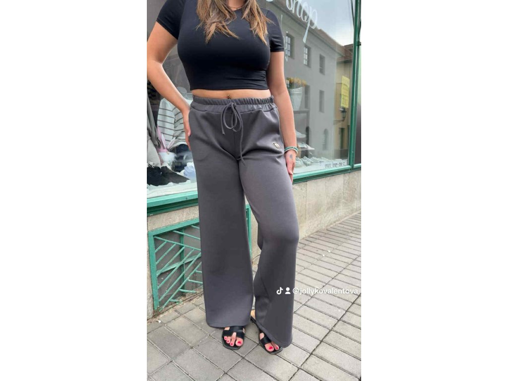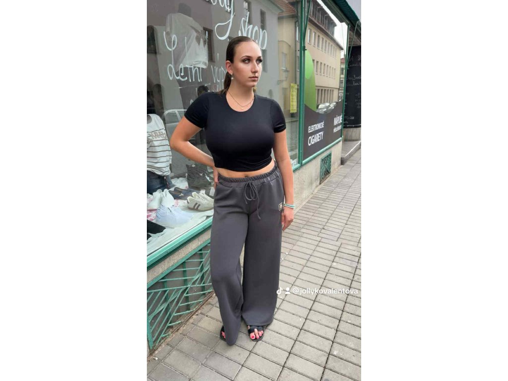 Tyto šedé široké kalhoty jsou must-have kousek do tvého šatníku! ✨ Jsou z příjemného materiálu, mají volný střih a pohodlnou gumu v pase se šňůrkou – ideální na každý den, ať už vyrazíš do města, do školy nebo na volný víkend.